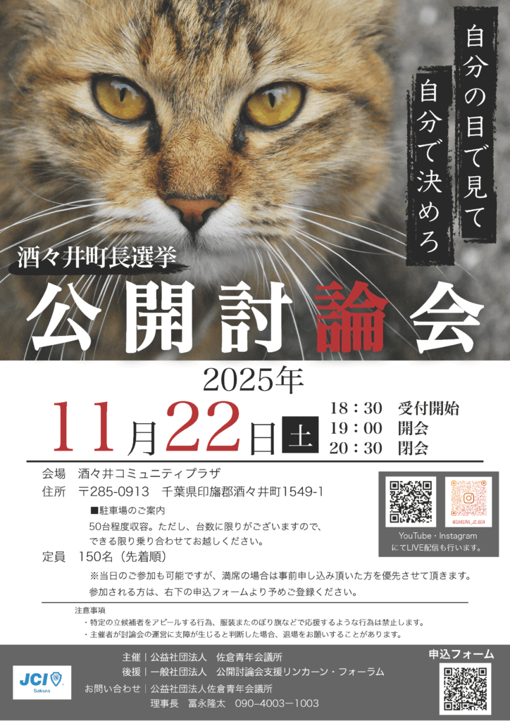 佐倉青年会議所では11月22日(土)に酒々井コミュニティプラザにて「酒々井町長選挙立候補予定者 公開討論会」を開催する運びとなりました。